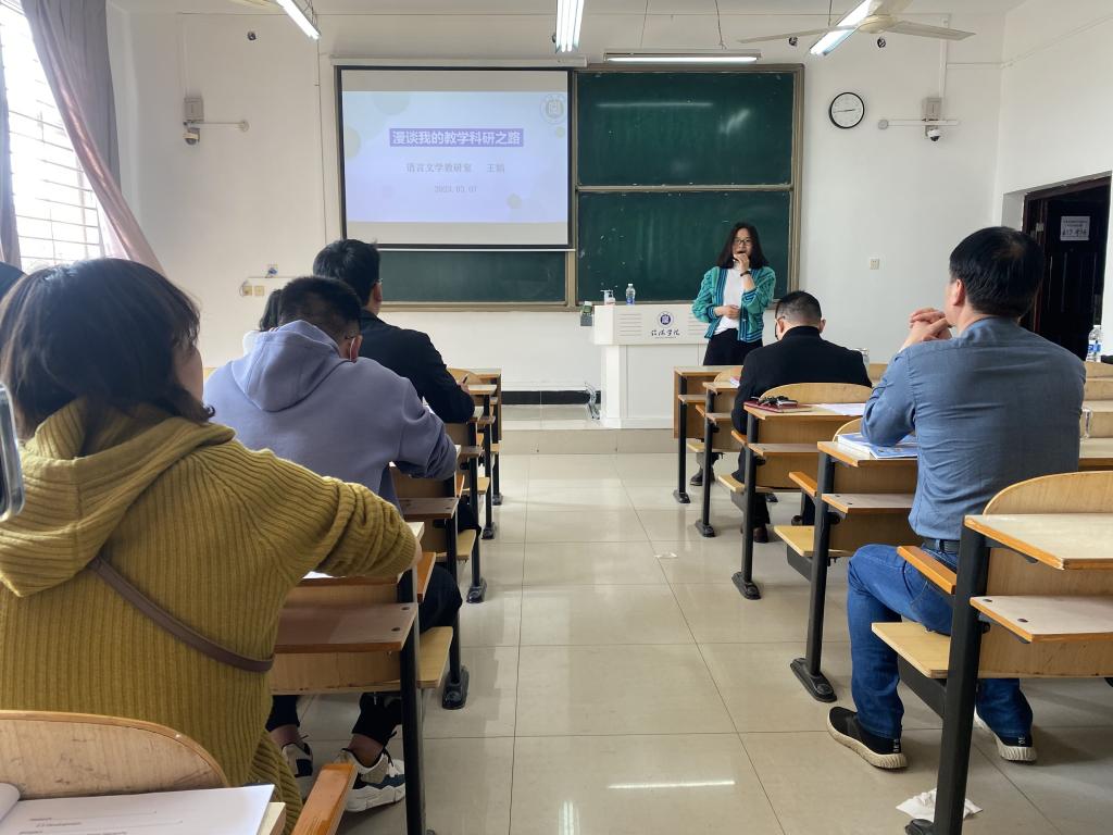 为帮助青年教师提高教学、科研水平,3月7日下午,外国语学院在外语楼202教室召开了青年教师培训会。培会训主题:路漫漫其修远兮,吾将上下而求索——漫谈我的教学科研。本次培训 由语言文学教研室王娟副教授主讲,李达主持。外国语学院院长罗德喜、党总支副书记程娇炎、教学副院长李静、学院干事、教务员和全体教师参加本次会议。