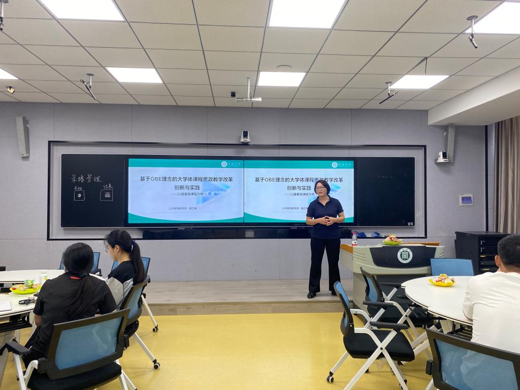 5月7日下午,由教师教学发展中心主办、公共体育教学部承办的主题为“基于OBE理念的大学体课程思政教学改革创新与实践--以健美操课程为例”的第三十三期教学沙龙在人文楼南楼智慧教室113举办。沙龙由公共体育教学部副教授剧红梅主讲,与来自公共体育教学部的全体青年教师围绕这一主题展开了研究与探讨。