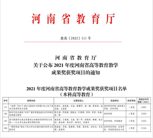 近日,河南省教育厅下发《关于公布2021年度河南省高等教育教学成果奖获奖项目的通知》(教高〔2022〕111号),我校4项教学成果喜获河南省高等教育教学成果奖。