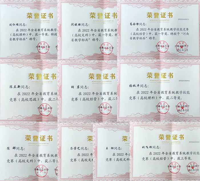 近日,由河南省总工会、河南省教育厅主办的全省教育系统2022年度教学技能竞赛活动落下帷幕。我校闫晓丽、刘仁植、高会静3名教师获一等奖,被授予“河南省教学标兵”荣誉称号;陈立新、张秋平、胡岩、陈娜4名教师获二等奖;姚飞羽、王松、厉芳艺3名教师获三等奖。