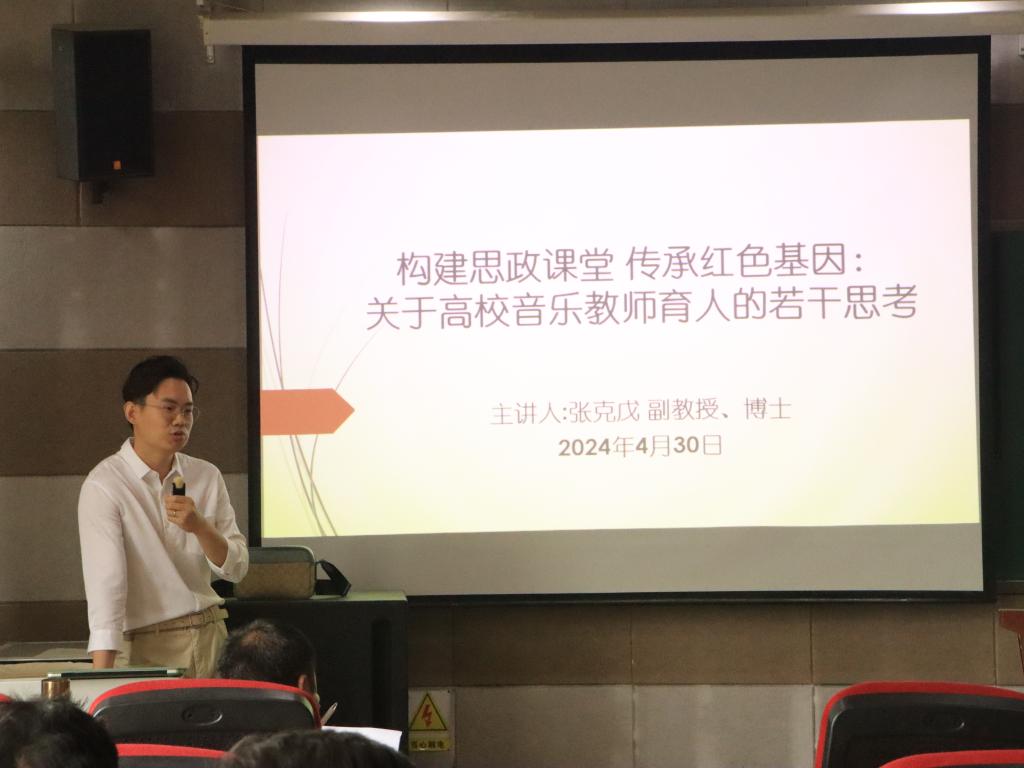 张克戊围绕如何将思想政治教育的理论知识、价值理念、以及精神追求融入到课程中,通过对一系列谱例的演奏讲解,从当下大学生的兴趣出发,按照从流行过度到古典的“反逻辑”,将两者紧密地结合在了一起,对思政元素潜移默化地对学生的思想意识、行为举止产生的影响及意义,以及如何在课堂上科学合理融入思政元素进行了讲解。
