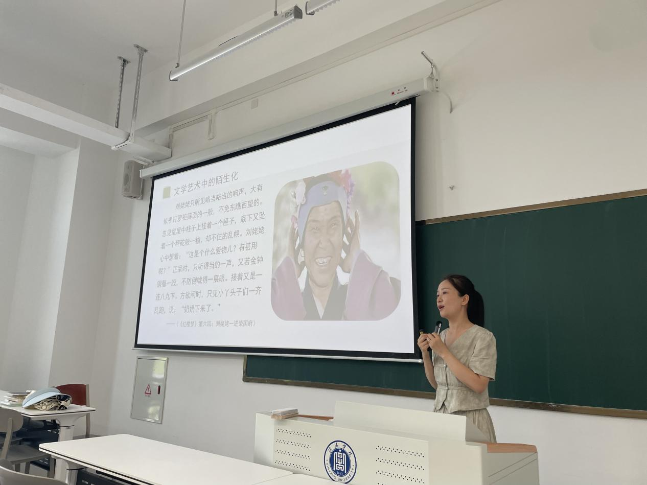 姚佳老师围绕“文学语言与陌生化”这一主题展开授课,她从“两株枣树”问题导入,激起学生的学习兴趣;然后通过课堂小游戏“与AI比赛写诗”展开合作探究,帮助学生找出文学语言的特点,从而引出“陌生化”理论;继而通过《红楼梦》《1984》《世事如烟》中的文本分析,帮助学生更好理解文学艺术中“陌生化”手法运用的效果,展开对文学本质的深入探讨。