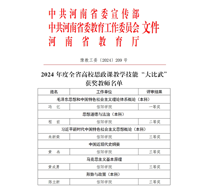 近日,河南省教育厅公布了《2024年度全省学校思想政治理论课教学技能“大比武”评审结果的通知》(豫教工委〔2024〕209号),我校马克思主义学院6位参赛教师获奖。其中,冯忆获《毛泽东思想和中国特色社会主义理论体系概论》一等奖,程前获《思想道德与法治》二等奖,朱新荣获《习近平新时代中国特色社会主义思想概论》三等奖、黄成勇获《马克思主义基本原理》三等奖、黄冉获《中国近现代史纲要》三等奖、陈立新获《形势与政策》三等奖。