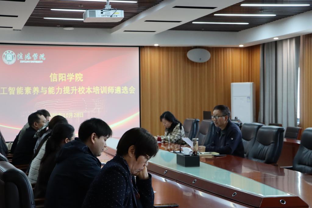 为贯彻落实习近平总书记关于人工智能的重要论述,深入实施国家教育数字化战略,落实《河南省教育厅办公室关于开展本科高校教师人工智能应用全员培训的通知》和《信阳学院教师人工智能素养与能力提升培训方案》要求。10月28日下午,教师教学发展中心在综合楼1410会议室组织召开信阳学院人工智能素养与能力提升校本培训师遴选会,各学院推荐的优秀教师参会。