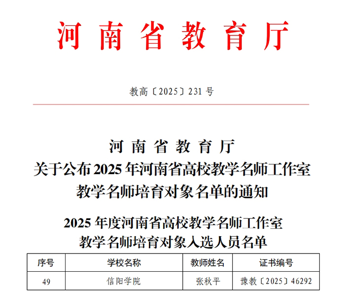 近日,河南省教育厅发布《关于公布2025年度河南省高校教学名师工作室教学名师培育对象名单的通知》(教高〔2025〕231号),我校张秋平副教授成功入选2025年度河南省高校教学名师工作室教学名师培育对象。此次全省高校共有50位教师获此殊荣,其中民办高校仅3位。这是我校办学历史上首次获得此类省级荣誉称号,具有里程碑意义。