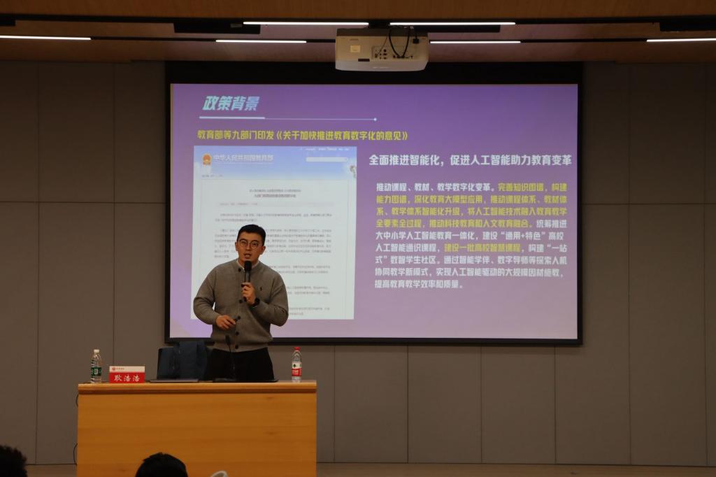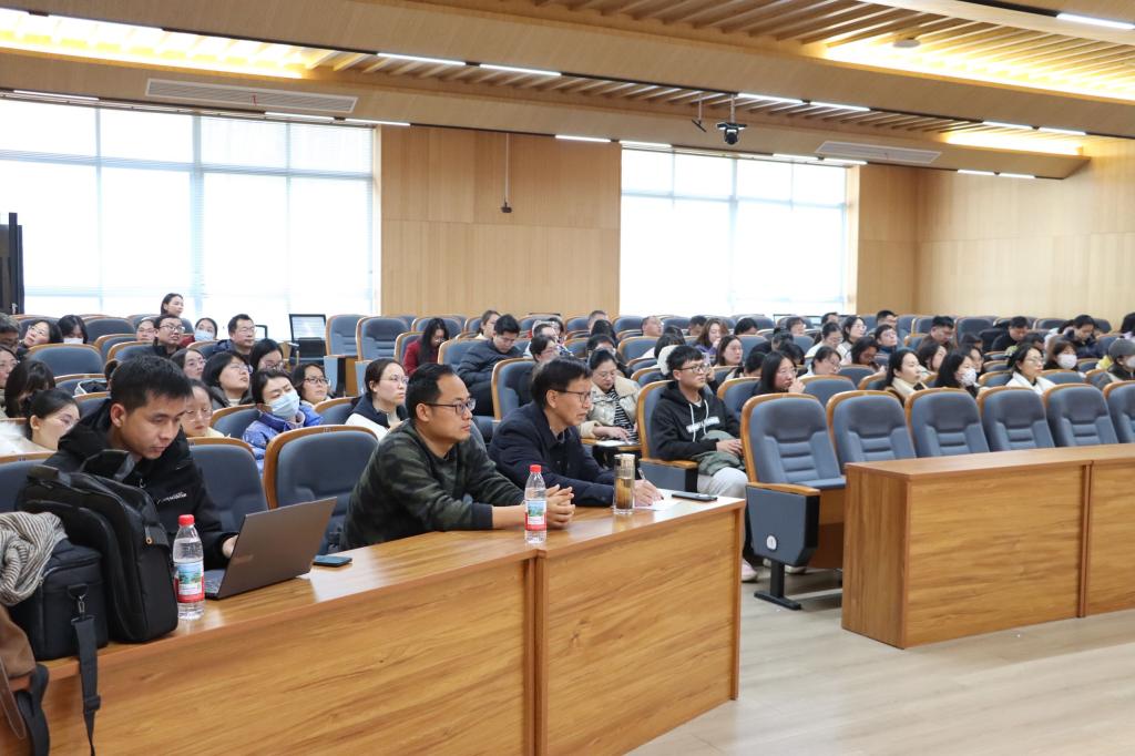 耿浩浩围绕“为什么?政策导向”“是什么?概念定义”“怎么做?教学创新”“怎么样?成果培育”四大核心模块展开讲解,其内容涵盖育人理念革新、办学路径升级、教学模式创新、学习范式转型、评价方式完善等方面。通过整合《大学物理》智慧课程、人工智能赋能生态文明教育创新实践等具体实例,阐述AI在大学课程的融合实践,分享课程改革路径与“教学研创” 育人模式探索方向,帮助教师打造系统化、场景化的教学环境,助力师生将理论知识转化为解决复杂实际问题的能力。参会教师表示,讲座内容系统性与实用性强,不仅深化了对AI赋能教学的认知,更掌握了具体的实践方法与操作路径,未来,将积极把所学所悟转化为教学创新的实际行动,持续推进课程内涵建设与教学质量提升。